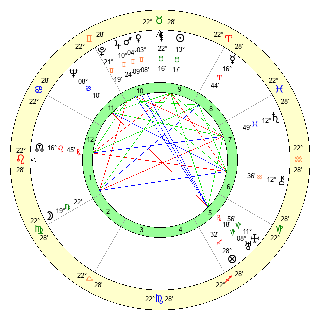 | Moon | 19 Virgo 25 | 16 Leo 8 | 8 Aquarius 36 |