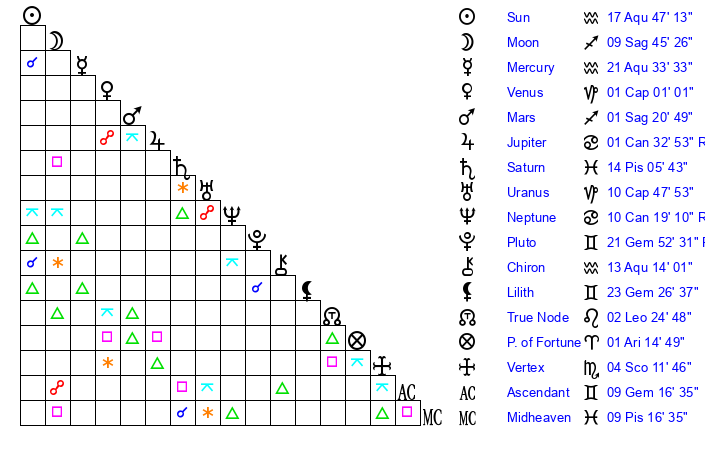 | Sun | 17 Aquarius 47 | 19 Aquarius 10 | 13 Gemini 52 |