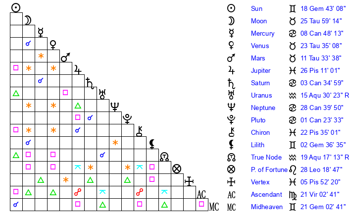 | Moon | 25 Taurus 56 | 13 Sagittarius 11 | 5 Gemini 12 |