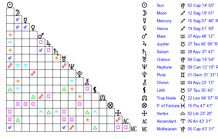 | Saturn | 29 Aquarius 4 | 13 Pisces 57 | 12 Pisces 13 |