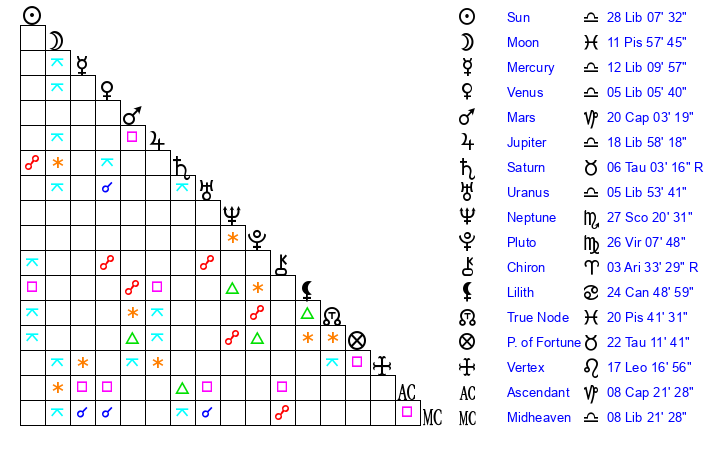 | Moon | 11 Pisces 56 | 0 Scorpio 35 | 2 Aries 47 |