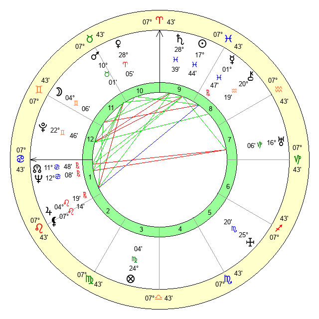 | Moon | 4 Gemini 10 | 13 Cancer 43 | 6 Virgo 24 |