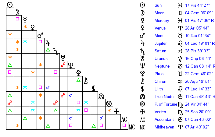 | Sun | 17 Pisces 45 | 18 Pisces 22 | 11 Cancer 19 |
