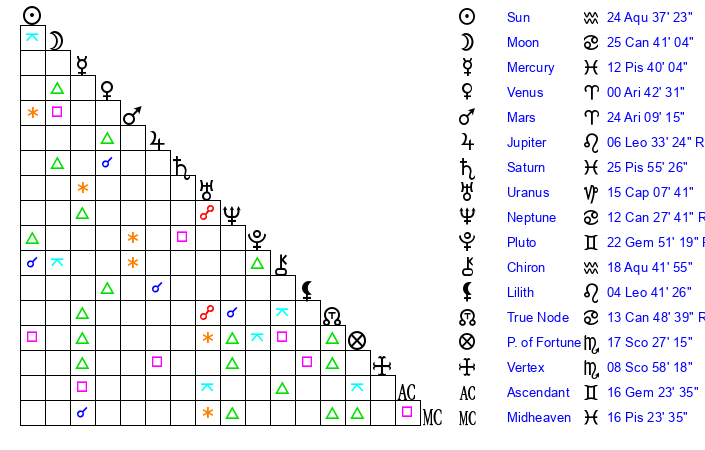 | Sun | 24 Aquarius 38 | 26 Aquarius 15 | 19 Gemini 22 |