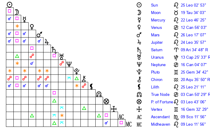 | Moon | 19 Taurus 39 | 24 Gemini 56 | 24 Leo 31 |