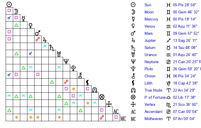 | Sun | 5 Pisces 29 | 7 Pisces 4 | 25 Gemini 50 |