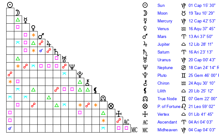 | Sun | 1 Capricorn 16 | 2 Capricorn 22 | 26 Aries 48 |
