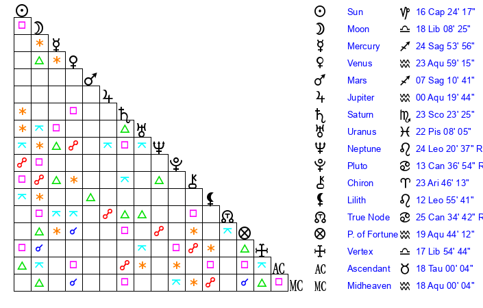 | Saturn | 23 Scorpio 51 | 14 Pisces 58 | 25 Scorpio 15 |