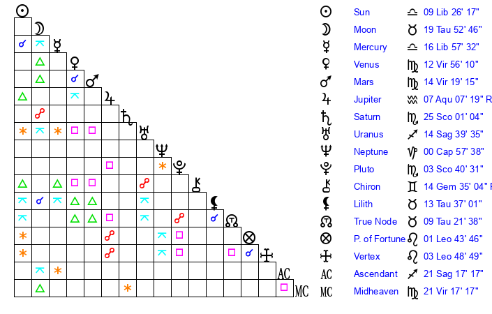| Moon | 19 Taurus 53 | 11 Aquarius 25 | 6 Scorpio 36 |