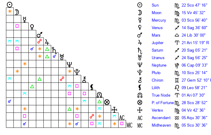 | Pluto | 10 Scorpio 25 | 1 Aquarius 37 | 11 Scorpio 45 |