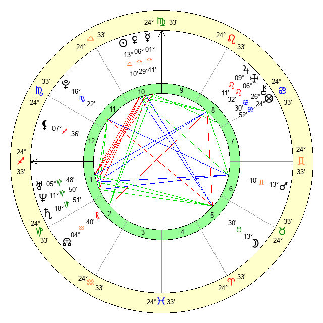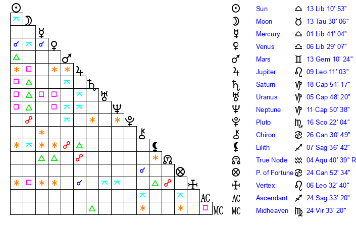 | Moon | 13 Taurus 15 | 7 Aries 24 | 2 Virgo 11 |