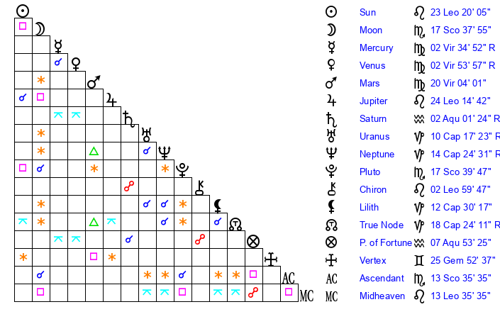 | Mercury | 2 Virgo 34 | 5 Leo 57 | 14 Virgo 30 |