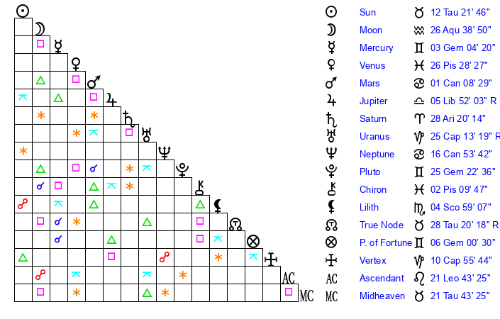 | Moon | 26 Aquarius 32 | 3 Leo 9 | 20 Taurus 35 |