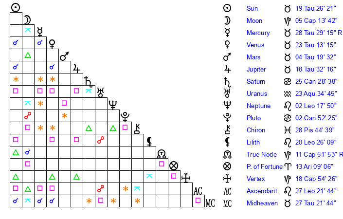 | Uranus | 23 Aquarius 32 | 26 Taurus 53 | 21 Aquarius 13 |