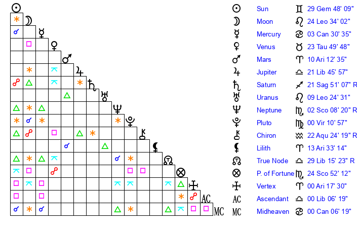 | Moon | 24 Leo 37 | 9 Taurus 9 | 16 Aquarius 6 |