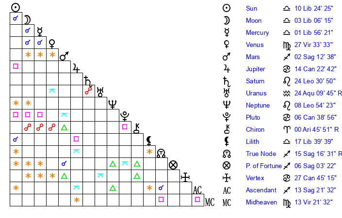 Sun | 10 Libra 24 | 11 Libra 28 | 28 Capricorn 20 |
