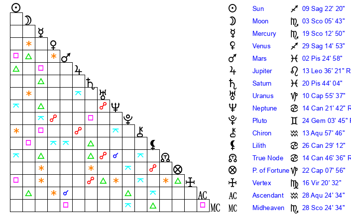 | Moon | 3 Scorpio 3 | 27 Sagittarius 50 | 20 Aquarius 5 |