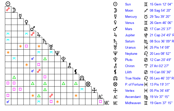 Sun | 15 Gemini 12 | 16 Gemini 0 | 21 Virgo 6 |