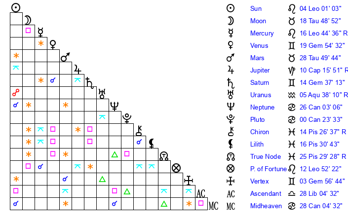 | Mercury | 16 Leo 44 | 12 Leo 6 | 7 Sagittarius 36 |