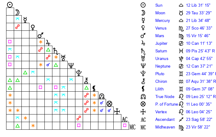 | Neptune | 12 Cancer 38 | 0 Aries 23 | 10 Cancer 26 |