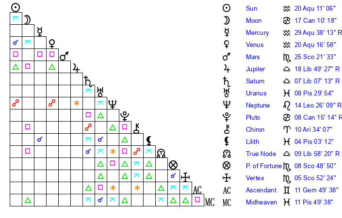 Sun | 20 Aquarius 11 | 21 Aquarius 12 | 1 Gemini 45 |