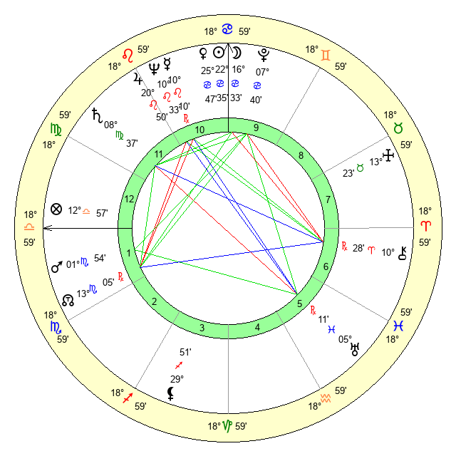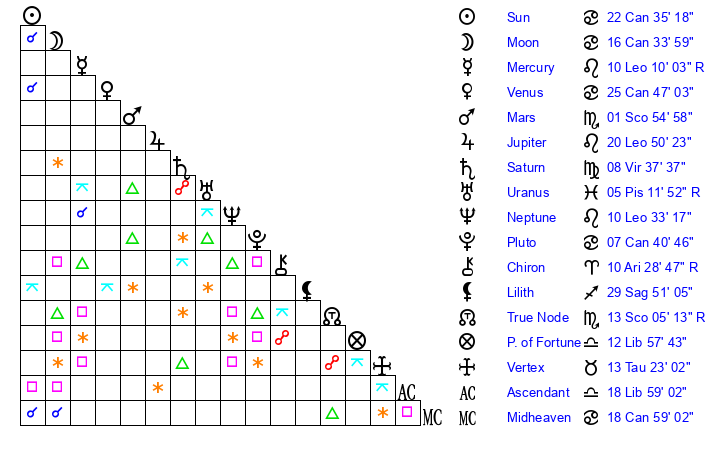 Jupiter | 20 Leo 39 | 8 Cancer 5 | 12 Virgo 18 |