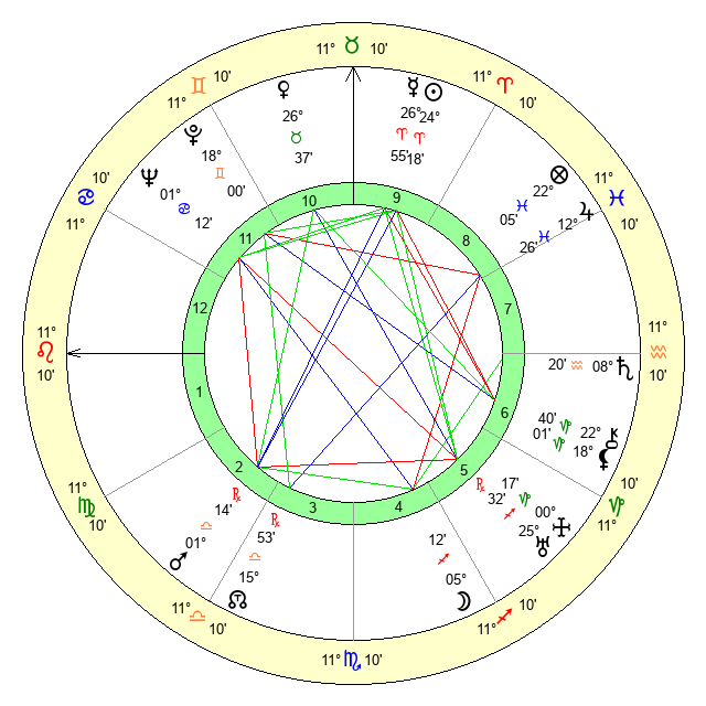 | Sun | 24 Aries 18 | 25 Aries 44 | 21 Leo 25 |