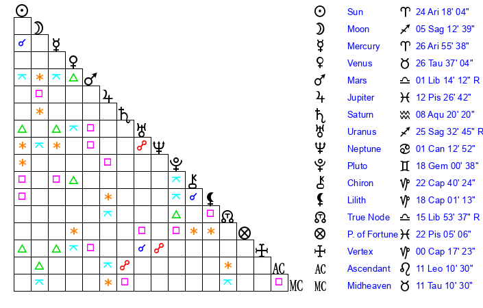 | Sun | 24 Aries 18 | 25 Aries 44 | 21 Leo 25 |