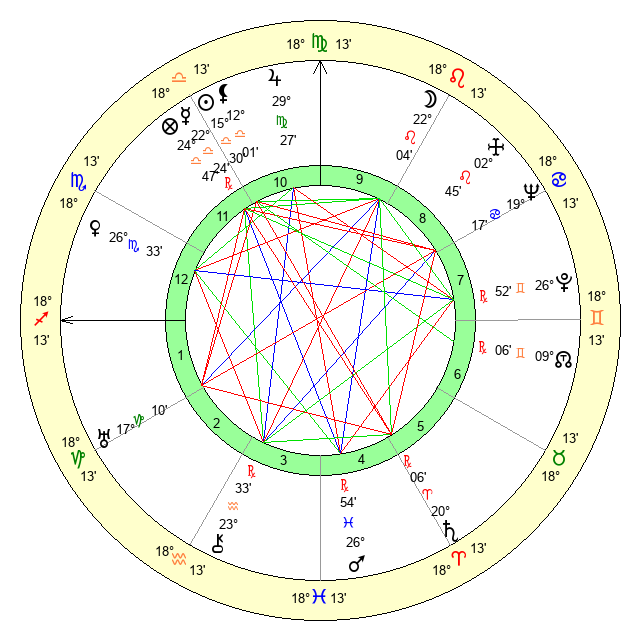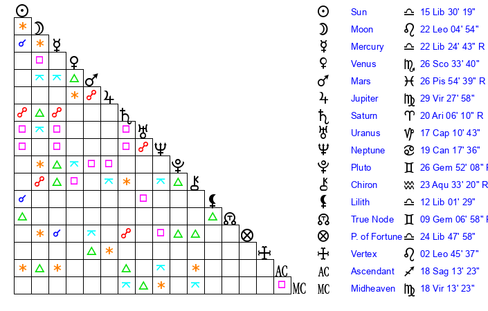 | Moon | 22 Leo 5 | 18 Taurus 26 | 12 Scorpio 27 |