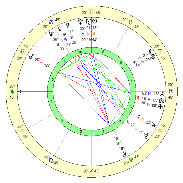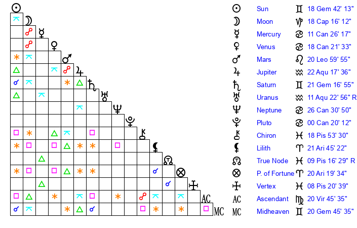 | Sun | 18 Gemini 42 | 19 Gemini 49 | 5 Libra 27 |