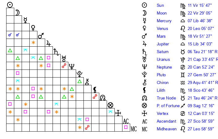 | Sun | 11 Virgo 16 | 12 Virgo 25 | 6 Capricorn 6 |