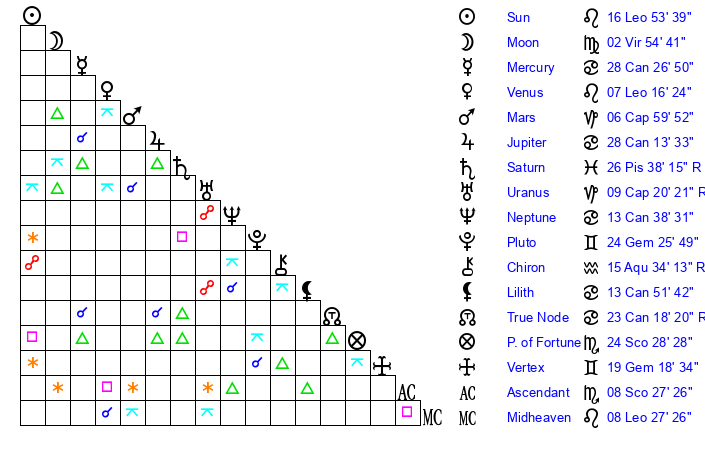 | Sun | 16 Leo 54 | 18 Leo 19 | 13 Sagittarius 26 |