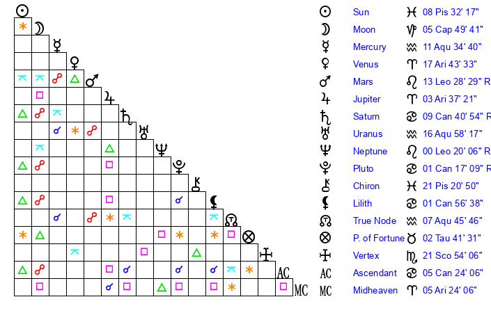 | Sun | 8 Pisces 32 | 10 Pisces 6 | 24 Gemini 56 |
