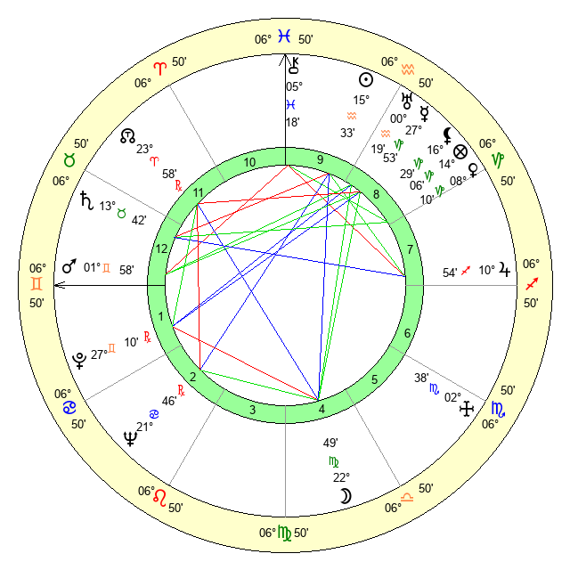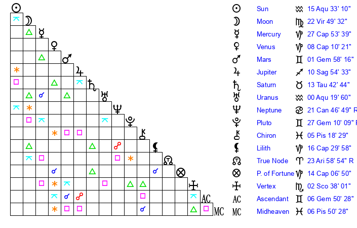 | Sun | 15 Aquarius 33 | 17 Aquarius 9 | 6 Gemini 57 |