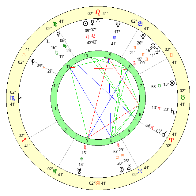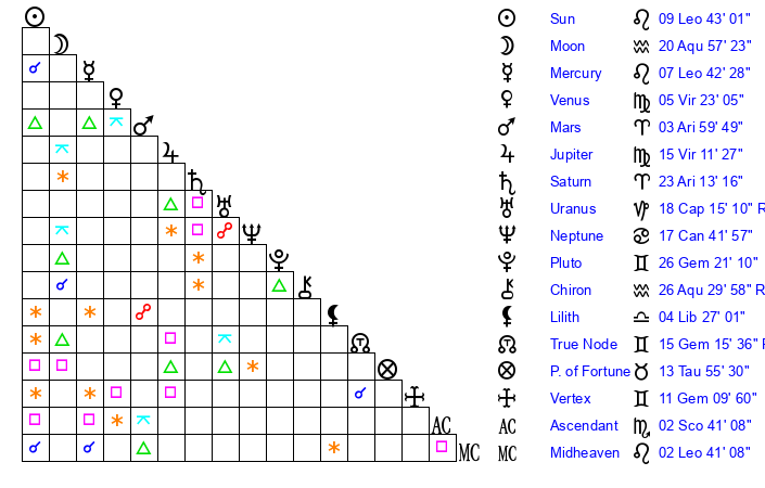 | Sun | 9 Leo 43 | 10 Leo 39 | 3 Sagittarius 49 |
