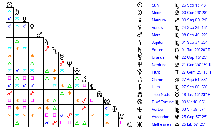 | Sun | 26 Scorpio 14 | 27 Scorpio 35 | 21 Pisces 45 |