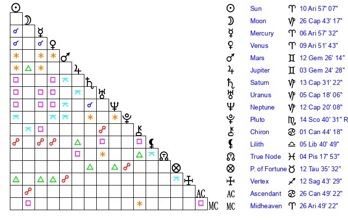 | Moon | 26 Capricorn 41 | 12 Taurus 59 | 3 Gemini 4 |