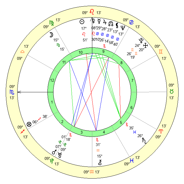 | Moon | 15 Virgo 24 | 19 Pisces 42 | 15 Capricorn 41 |