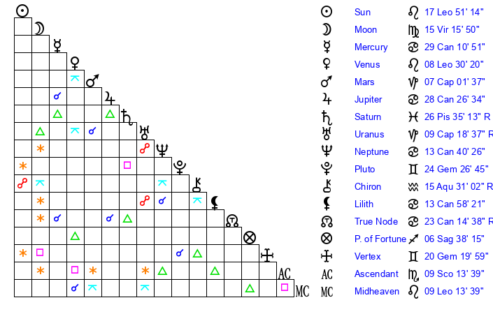| Moon | 15 Virgo 24 | 19 Pisces 42 | 15 Capricorn 41 |