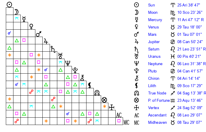 Sun | 25 Aries 39 | 26 Aries 57 | 7 Leo 25 |