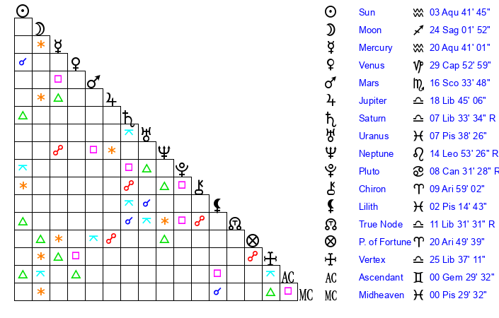 Sun | 3 Aquarius 42 | 4 Aquarius 42 | 16 Taurus 6 |
