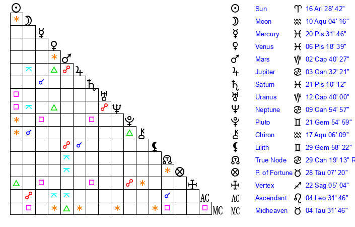 | Moon | 10 Aquarius 6 | 16 Leo 13 | 6 Gemini 38 |