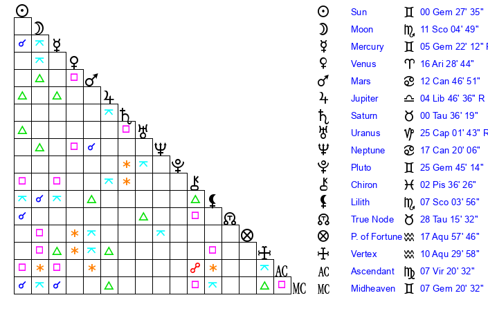 | Pluto | 25 Gemini 45 | 3 Aquarius 44 | 27 Gemini 54 |