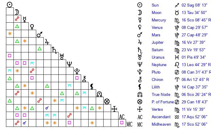 Sun | 2 Sagittarius 8 | 2 Sagittarius 55 | 17 Pisces 35 |