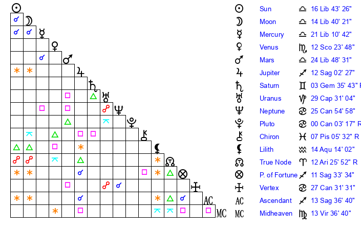 | Sun | 16 Libra 44 | 17 Libra 21 | 10 Aquarius 57 |