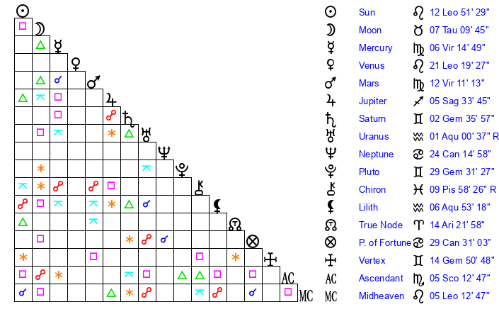 | Sun | 12 Leo 52 | 13 Leo 31 | 4 Sagittarius 6 |