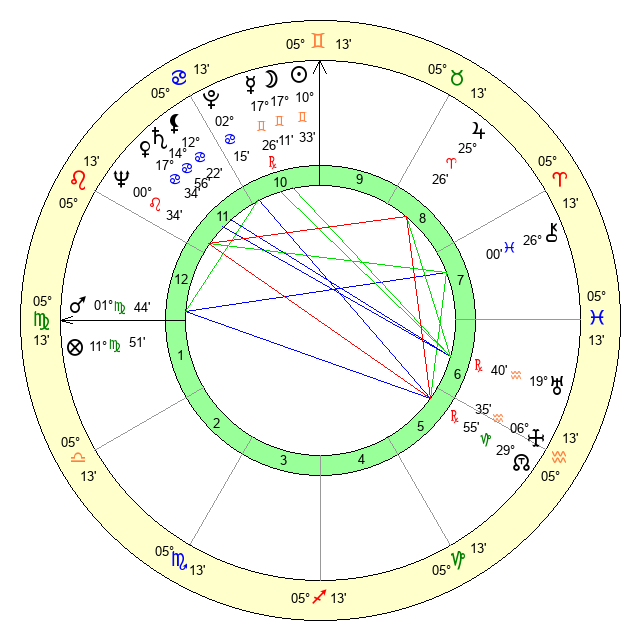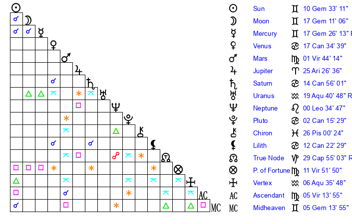 | Sun | 10 Gemini 33 | 11 Gemini 10 | 25 Virgo 8 |