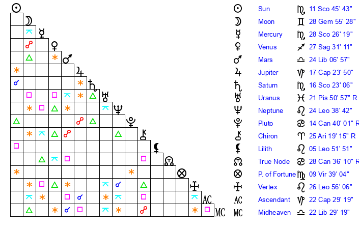 Sun | 11 Scorpio 46 | 12 Scorpio 46 | 22 Aquarius 14 |