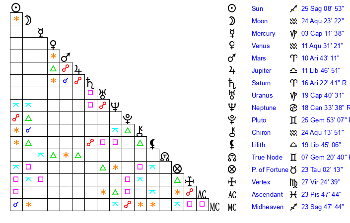 | Moon | 24 Aquarius 22 | 26 Cancer 16 | 16 Taurus 38 |
