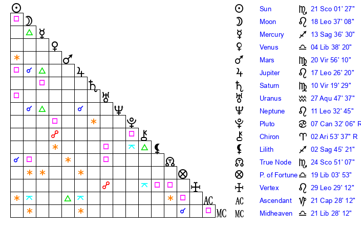 Sun | 21 Scorpio 1 | 22 Scorpio 34 | 7 Pisces 34 |